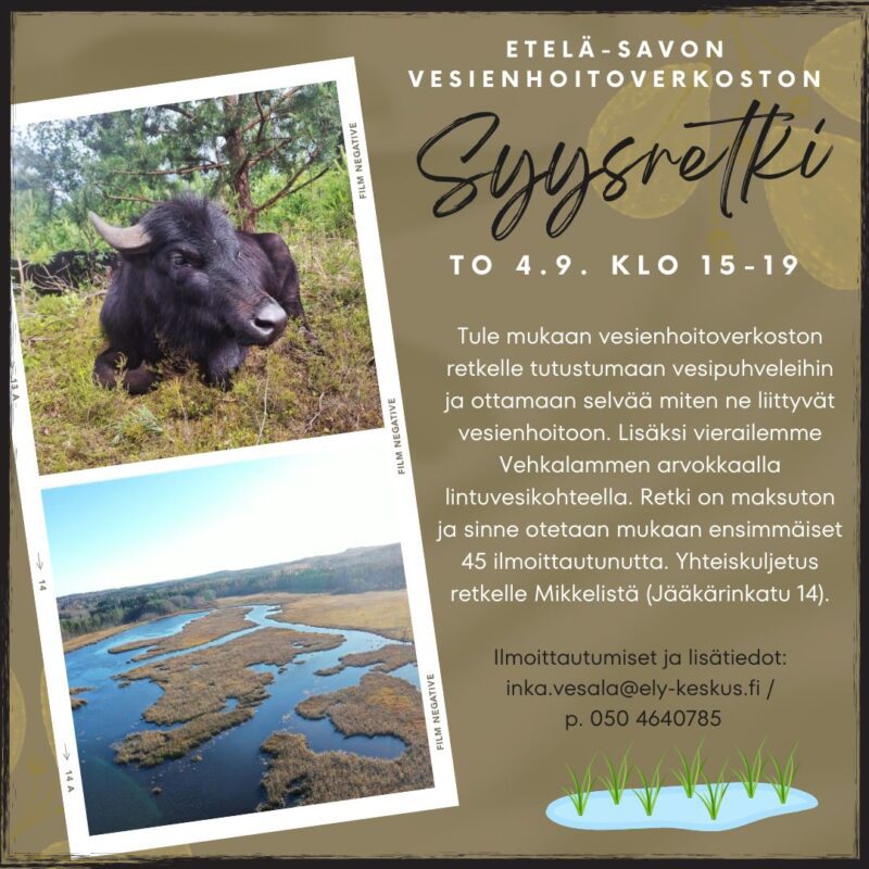 Lämpimästi tervetuloa Etelä-Savon vesienhoitoverkoston syysretkelle Pieksämäelle torstaina 4.9. Yhteiskuljetus kohteisiin Mikkelistä